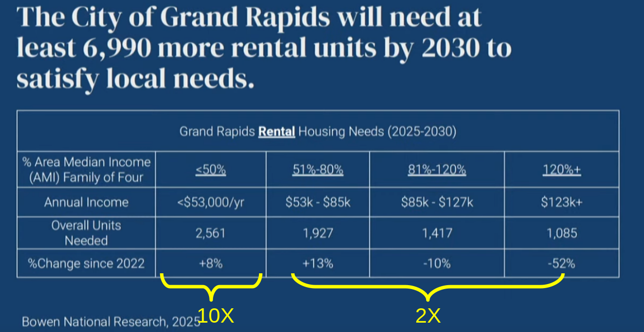 In recent history for-sale housing has meant single-unit detached units [aka: houses]. However, the city of Grand Rapids is built out, meaning there simple are not enough vacant lots suitable to that type of housing to have any meaningful impact relative to demand. The city will need to [finally] allow the transition from single-unit detached to a a greater variety of for-sale product. This means condos, townhouses, small houses, etc... Those other housing types potentially also address construction cost issues. Hopefully this liberalization will come in the new zoning ordinance, yet that will not arrive until 2028, although we have known what is necessary for more than a decade.