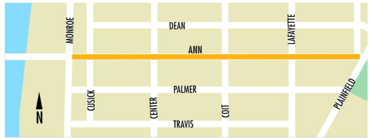The 2025 reconstruction of Ann St is complete; this added bike lanes to both sides of the road as well as reducing the grossly over-provisioned on-street parking by 50%. Now only the the south side of the road has on-street parking. The narrowing of the lanes - thanks to the bike lanes and curb extensions - should also reduce the reckless speeds of motorists, especially those exiting the interstate.