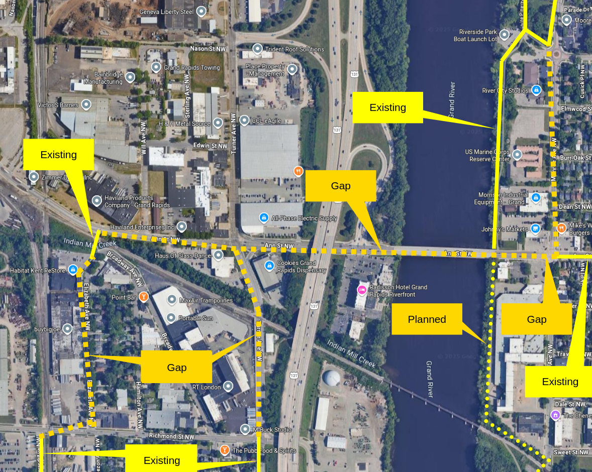 The last easement has been secured, ultimately it required purchasing the property at 1615 Monroe Ave NW. The railroad, which operates ~2 trains a day over river, told the project to go pound sand. So the trail will swing out to Monroe Ave, duck under the railroad's overpass and then swing back to the river's edge. With this property secured, and thus the railroad out of the picture, the project should be going out to bid any day now. We'll see. Given this is ARPA funding which has a spend-by deadline in 2026 this is running very down to the wire.