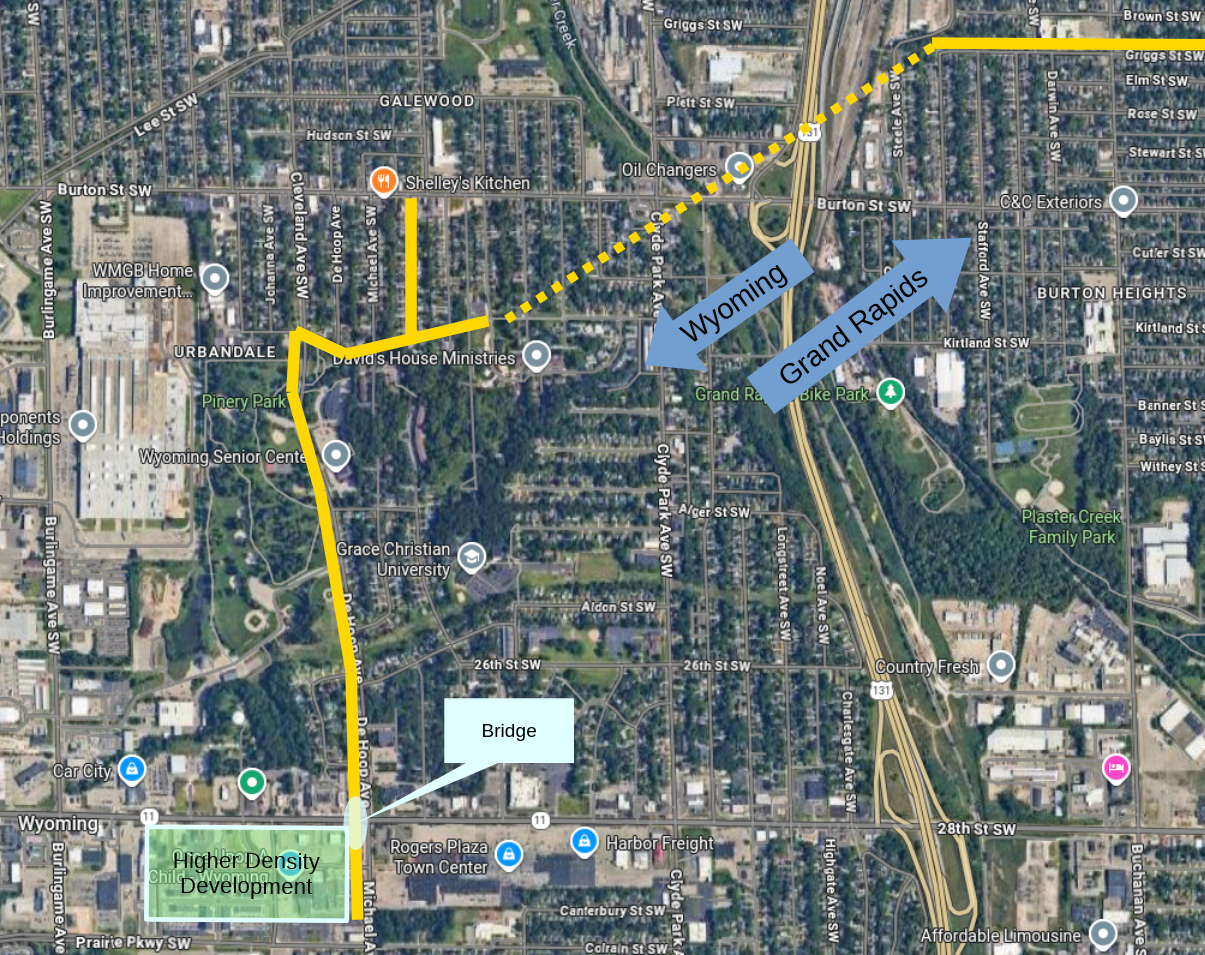 The city of Wyoming has its own trail and bike path network, also under development. Recently a significant part of that plan was installed: a pedestrian and cyclist bridge over 28th St connecting Pinery Park to the north with the higher density development zone established on the south side of the 28th. The HOM Flats development contains 386 rental units with phase three of the development underway which will add an addition two hundred (200) units, for a total of nearly six hundred (600) residential units. This makes HOM Flats one of the largest residential developments in the urbanized area. The pedestrian bridge will connect all of those citizens to the urban fabric, without having to risk their lives crossing MDOT's urban planning masterpiece (28th St),