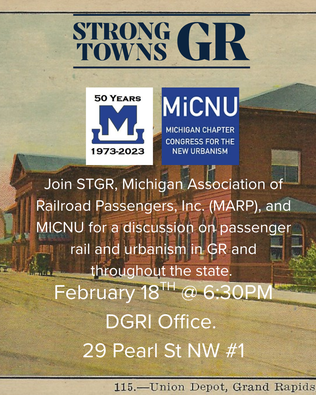 Join STGR, the Michigan Association of Railroad Passengers (MARP), and the Michigan chapter of the Congress for New Urbanism in a discussion on passenger rail and urbanism in Grand Rapids and throughout the state.