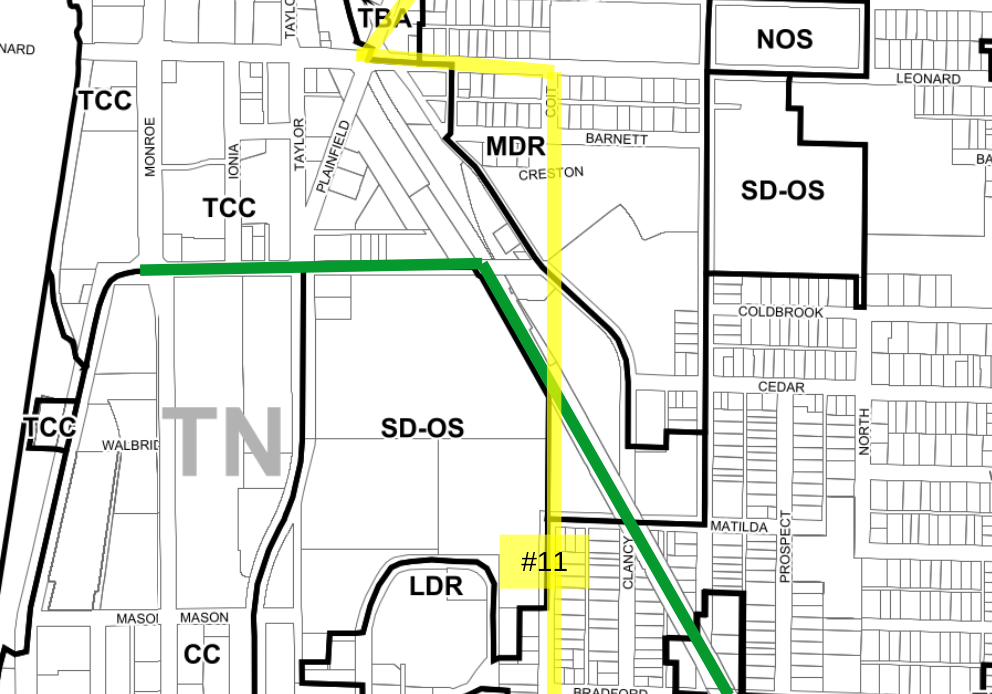 Neighborhoods: Belknap / Monroe North The west end of the proposed route is zoned as CC (City Center) and TCC (Transitional City Center), the two zones with the highest development and residential potential. ![]()