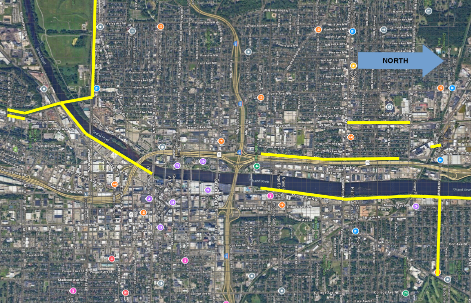 How to solve traversing north/south across the downtown core remains an unanswered question. At this point the best path for cyclists is likely to use the enhanced bike gutter on Division Ave south of Coldbrook St to Lyon St, and then the newly enhanced sidewalk of Division Ave to Monroe Center. The reconstruction of Division Ave from Lyon St to Fulton St which took place over the last two years was pitched as a bicycle through-way. Unfortunately it was value-engineered, and tainted by the interference of MDOT, into a wider but janky sidewalk. Then at Fulton a cyclist is dumped into what is little better than a wanna-be highway (Fulton St) with no clear next step in their route.