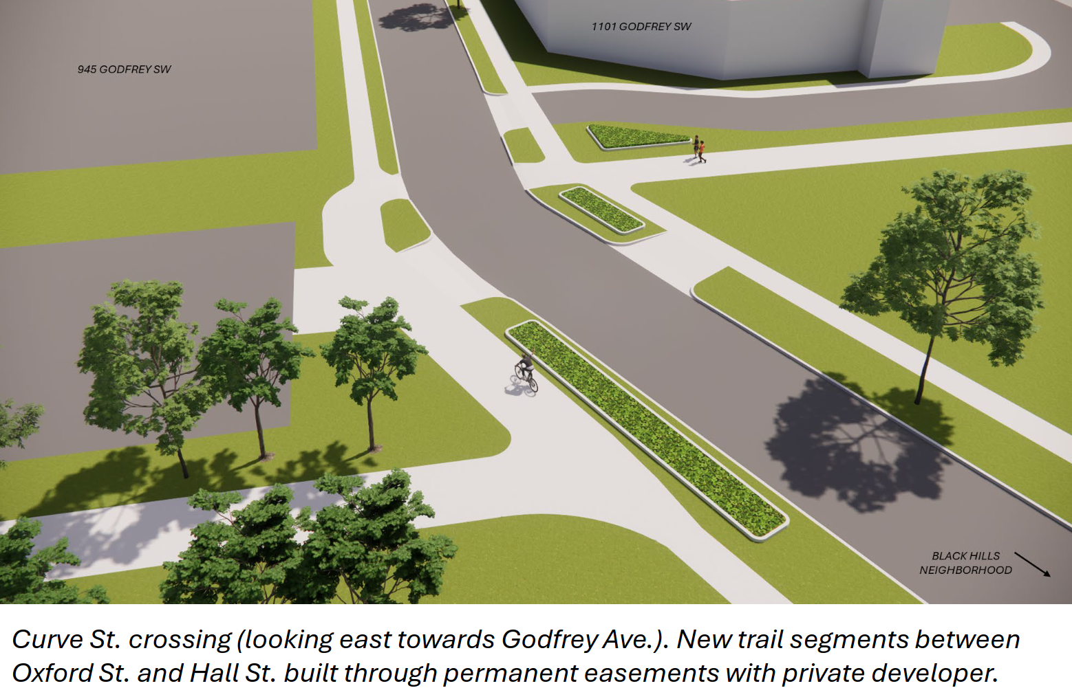 For years now the Oxford Trails has been a hidden gem, a fun extension of the Millennium Park and Butterwork Landfill trails, and a rare pedestrian and cyclist oriented river crossing. But now the contracts are out to realize its potential as a real bit of infrastructure connecting the West Side and the Triangle district with all its venues and amenities to the Black Hills and Roosevelt Park neighborhoods. And an opportune time as Godfrey Ave sees multiple developments and renovations bringing nearly five hundred (500) residential units to the corridor. The trail, which now connects the West Side all the way to the