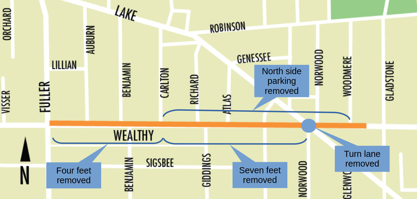 The street will be narrowed by four feet from Fuller Ave to Carlton Ave and by seven feet from Carlton Ave to Lake Drive. Narrowing the street slows traffic and makes space available for other, more productive infrastructure, including sidewalks and bike lands. The dangerous right-turn lane on Wealthy St at Lake Drive will be removed as well as the street parking on the north side from Carlton Ave to Woodmere Ave.